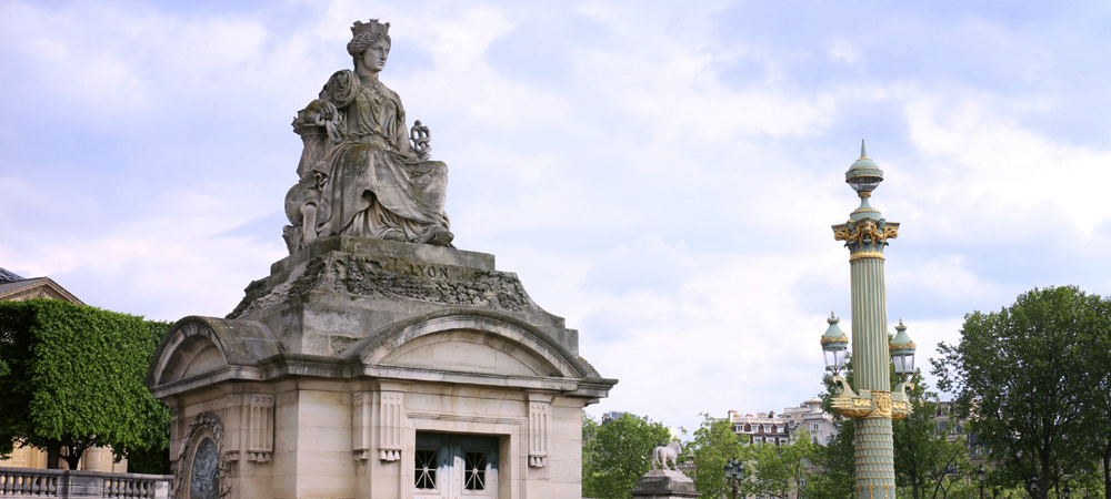 Première étape : rendez-vous place de la Concorde et constatez que le lieu est encerclé par 8 statues représentant les principales villes de province. Allez vous prosterner devant celle de la ville de Lyon, achevée en 1838 et installée côté jardin des Tuileries, près de la Seine. Lyon est représentée sous les traits d’une femme à l’air grave, un caducée et ses serpents dans la main gauche (lié à Mercure, dieu du commerce). À sa droite, une corbeille d’où s’échappent des écheveaux et des fils de soie (les Canuts ne sont pas loin !). À ses pieds deux cruches (on parle bien des récipients ici…) déversent leur eau, avec les inscriptions « Rhône » et « Saône ».