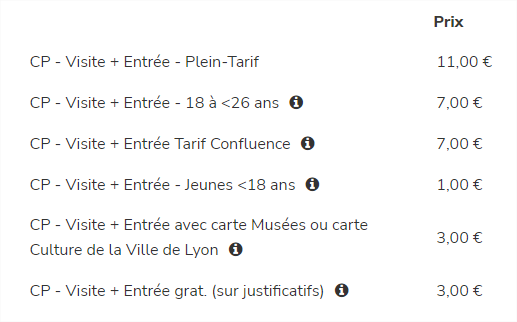 Le tarif pour participer à ces visites guidées est composé de l’entrée au musée et de la visite. Dans notre cas, nous ne payons que ma visite adulte (3 euros) et celle enfant (1 euro), car j’ai la carte Culture de la Ville de Lyon. L’entrée est gratuite pour les enfant de moins de 18 ans. Vous trouverez ci-dessous le détail des prix d’entrée d’une de ces visites.